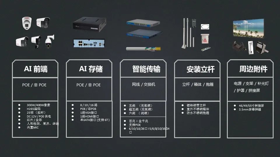 新集云产品系列分为AI前端、AI存储、智能传输、安装立杆、周边附件五大类