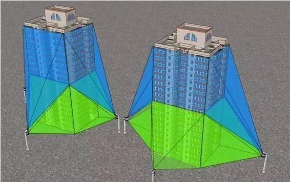 对于一个楼高在100米左右的大楼来说,可以通过3个相机进行覆盖,一个摄像机照0—15米的高度,一个摄像机照15-30米的高度,一个摄像机覆盖30-100米的高度: